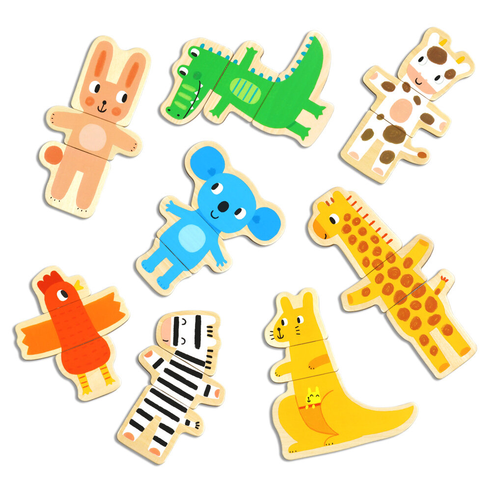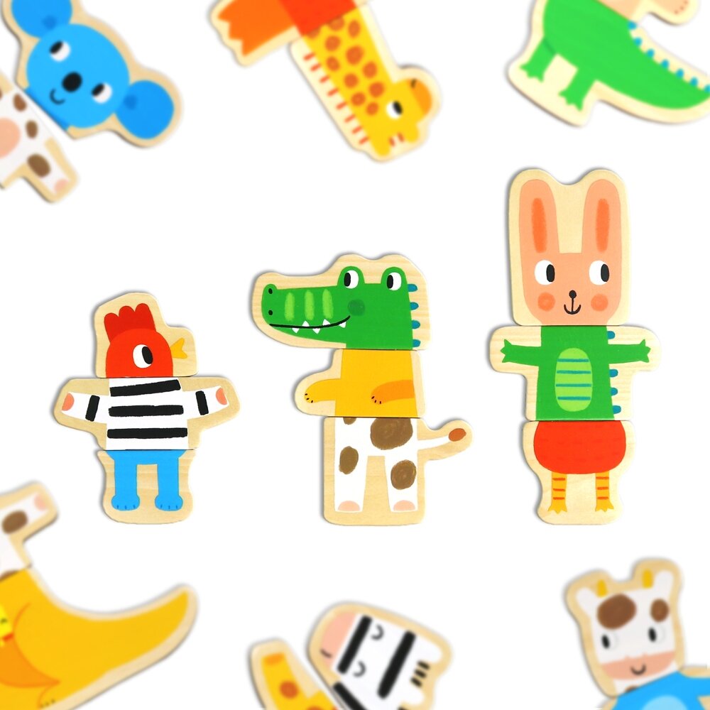 這是有趣的動物拼圖,每隻動物都可分成頭部、腹部、腿部等三塊。