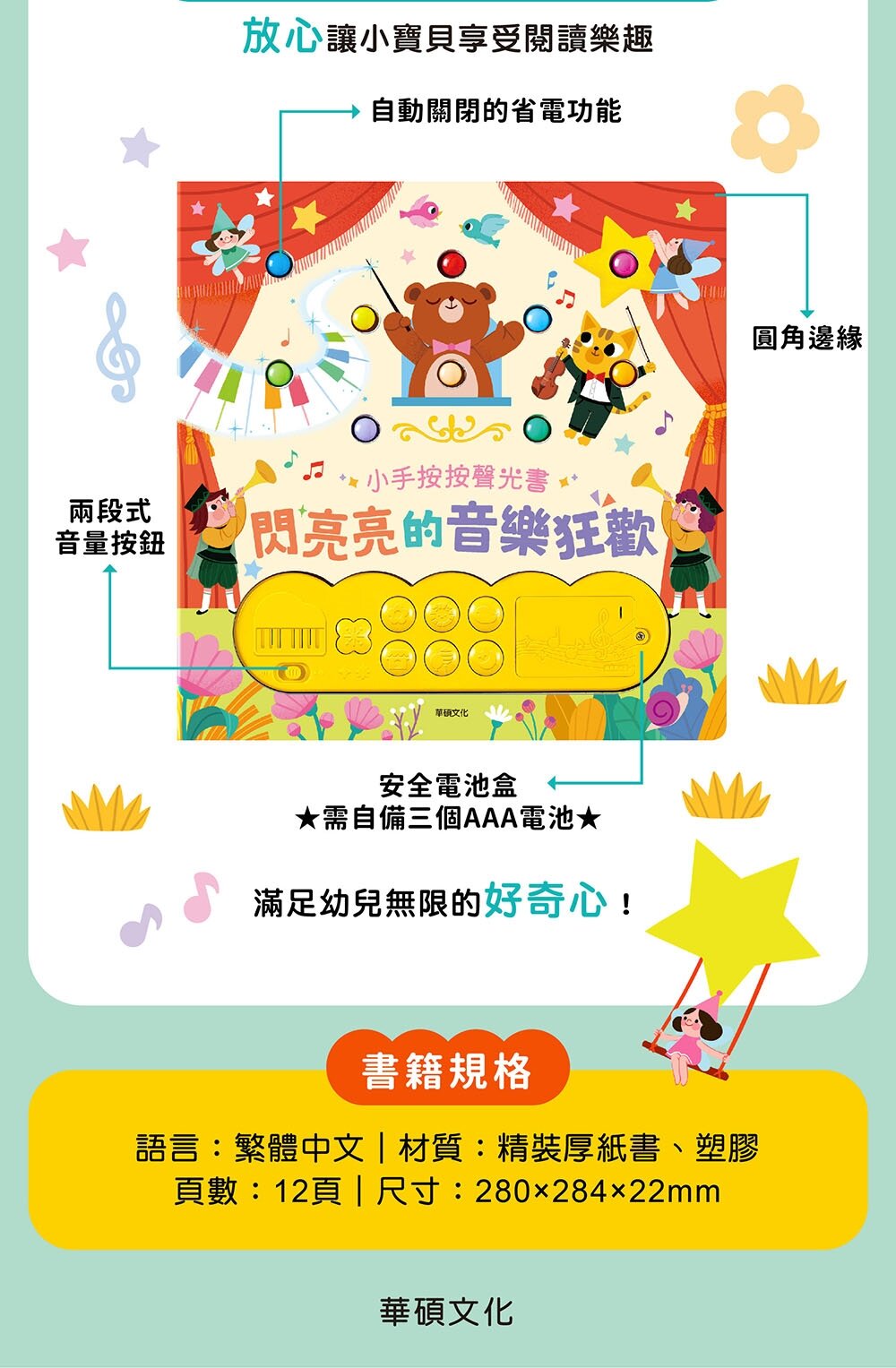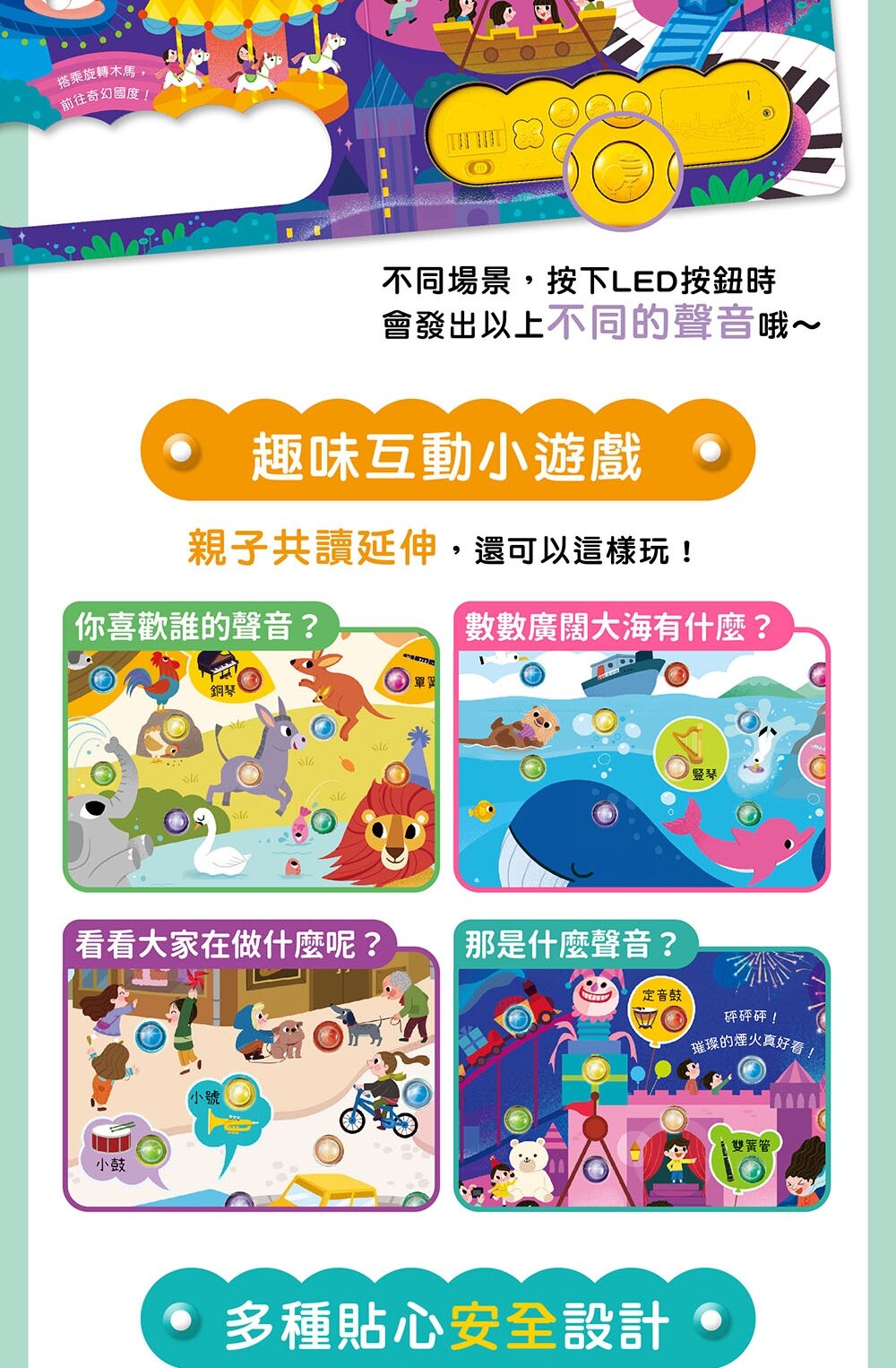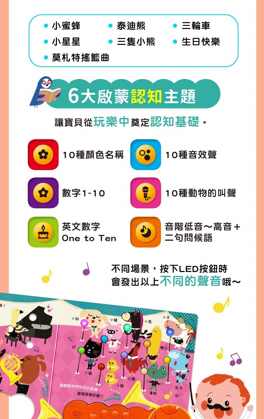 鋼琴、小鳥、蜜蜂的聲音從書中響起,10個彩色LED按鍵 隨著旋律閃爍,像是一場精心策劃的音樂派對!