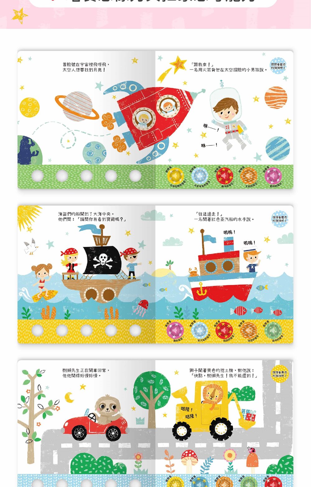 翻開書本,按下按鍵,奇妙的聲音和故事交織出一場場冒險旅程!從太空到叢林、從海洋到公路,讓孩子透過聽覺、觸覺和視覺的多重刺激,開啟探索世界的奇幻之門!