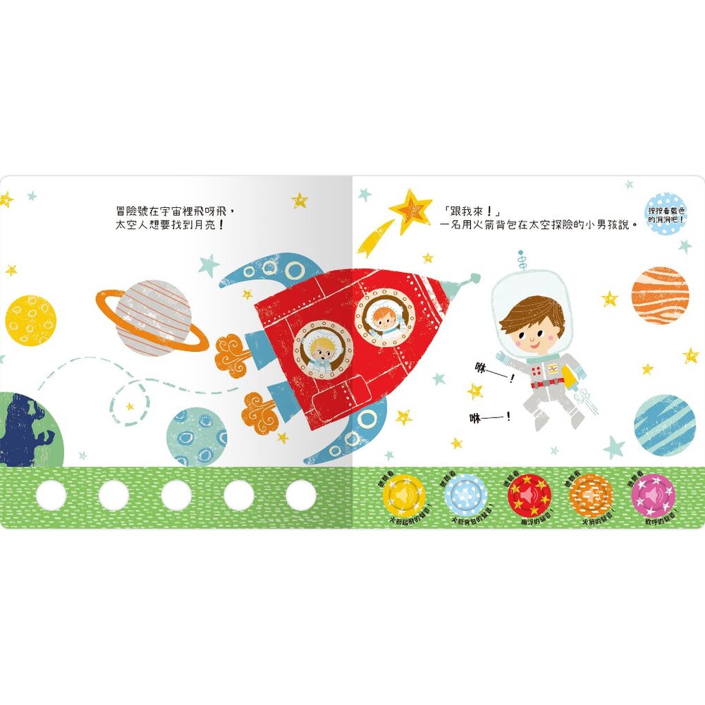 戴上太空頭盔,啟動火箭引擎,與太空人一起探索星際!按下按鍵,聽聽火箭起飛、幽浮漂浮的聲音,跟著故事體驗驚險又奇妙的宇宙冒險!