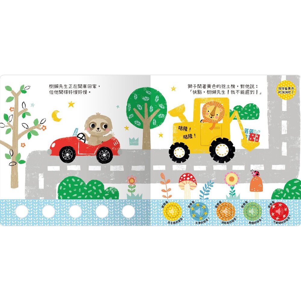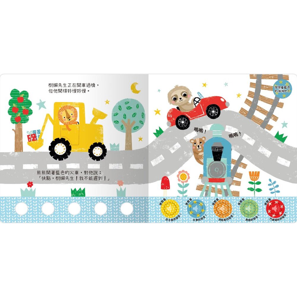 跟著樹懶先生一起開車回家吧!從挖土機到火車、從消防車到飛機,每一頁都藏著交通工具的獨特聲音,讓孩子在遊戲中認識不同的車輛!