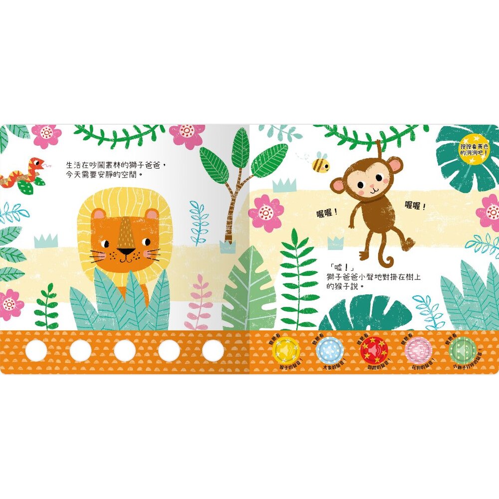 跟著獅子爸爸穿越叢林,一路說服吵鬧的動物們小聲點。按下按鍵,聆聽猴子、大象和小獅子打呼的聲音,體驗安靜與溫馨的叢林時光。
