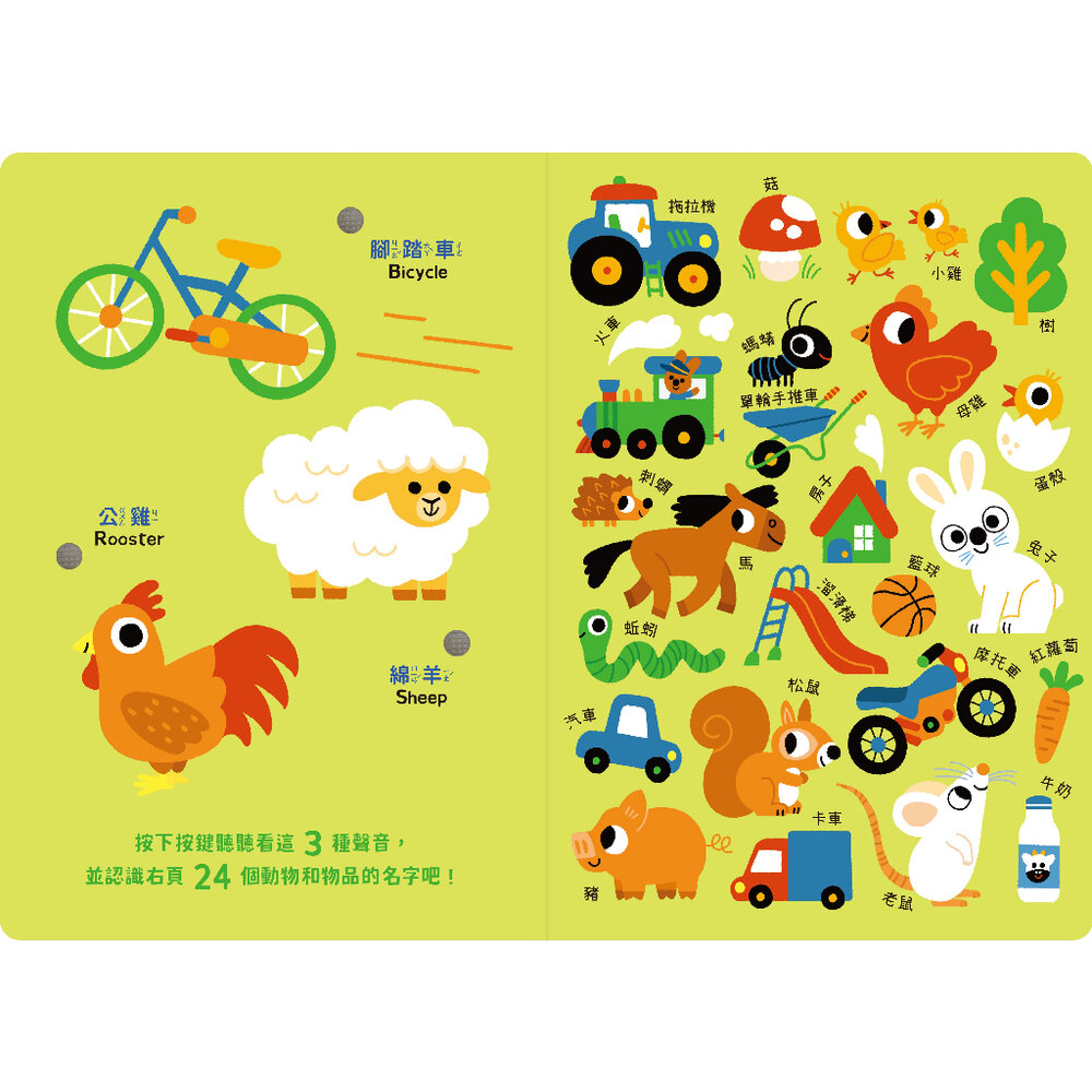 先觀察每頁的圖案,按下隨機播放按鍵,聆聽聲音後猜猜是誰發出的,再在書中找出它的位置!在互動遊戲中提升孩子的專注力、觀察力與解決問題的能力。