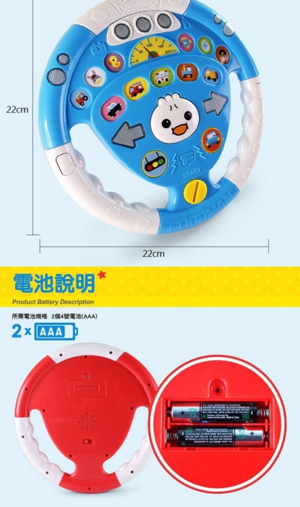 內容物:藍色汽車方向盤1個、鑰匙1個、全景圖一組、AAA電池*2
