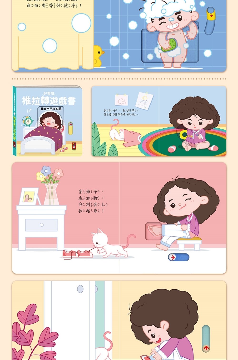 本書利用推推、拉拉、滑滑等多種互動機關,讓孩子能在閱讀過程中身歷其境,在遊戲中也能動動手指,促進手眼協調,並且強化手指的肌肉發展,除了遊戲外,也能在遊戲中學習,培養生活好習慣!