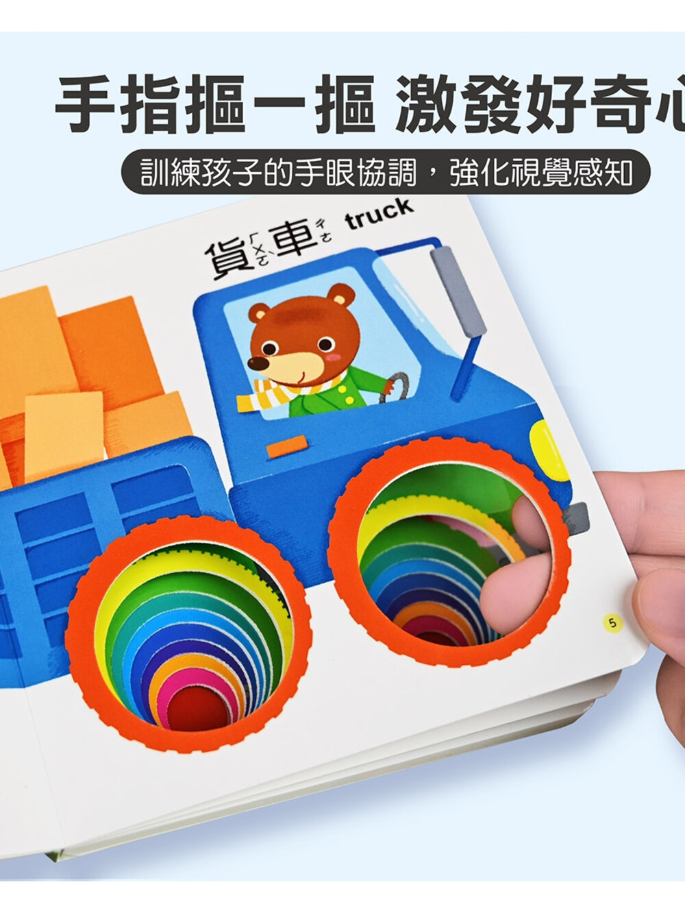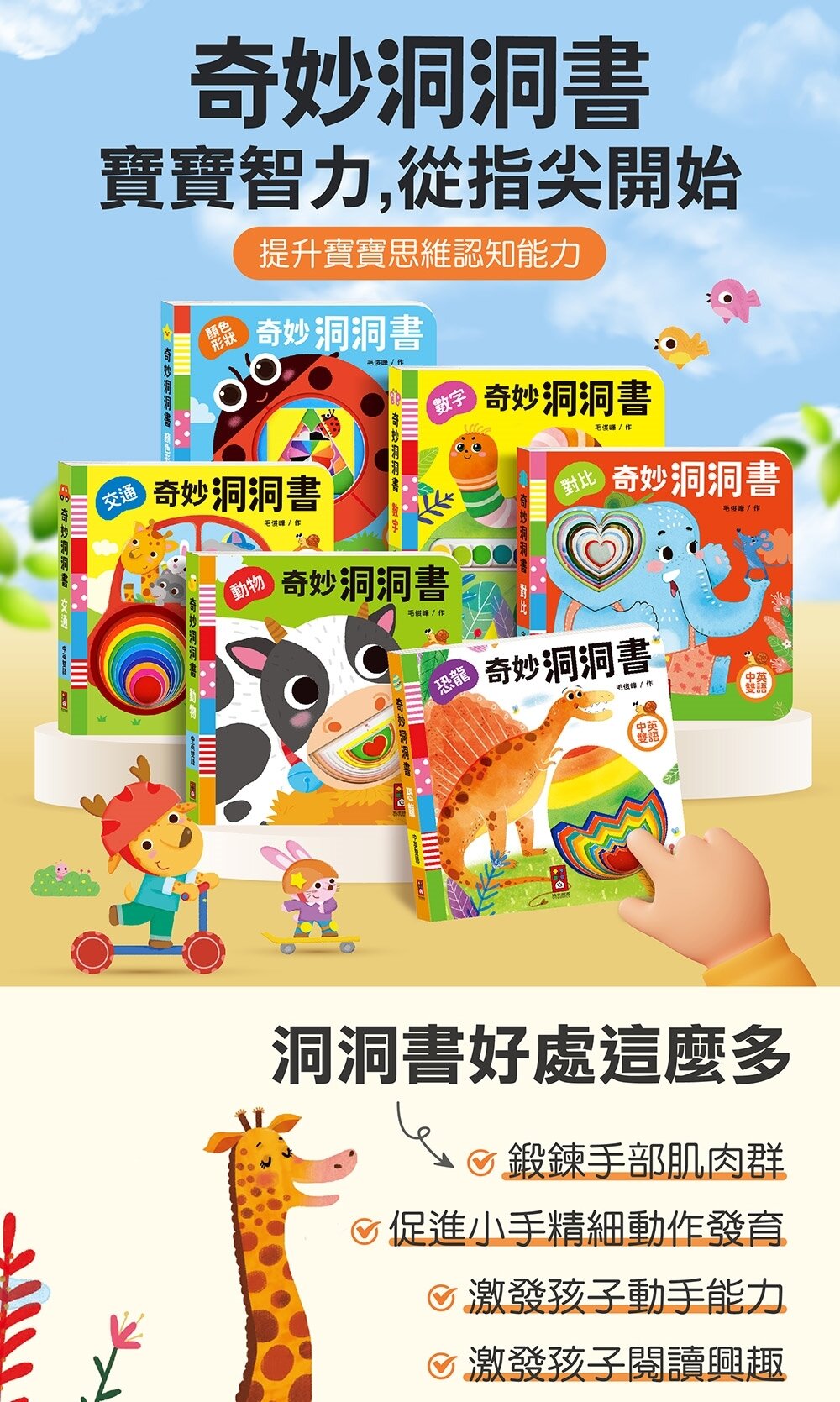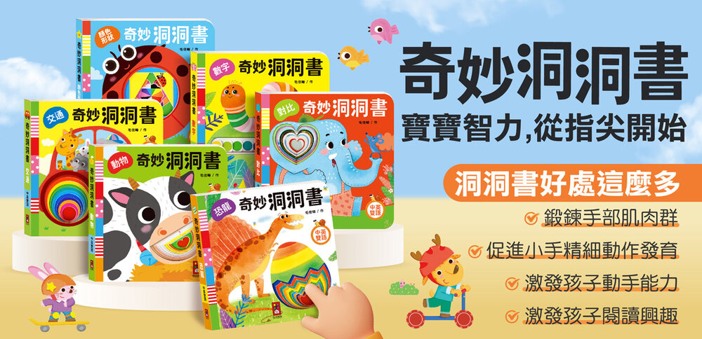 每本書都有不同造型或大小的洞洞,讓孩子可以觸摸、戳挖,促進手指精細動作訓練。