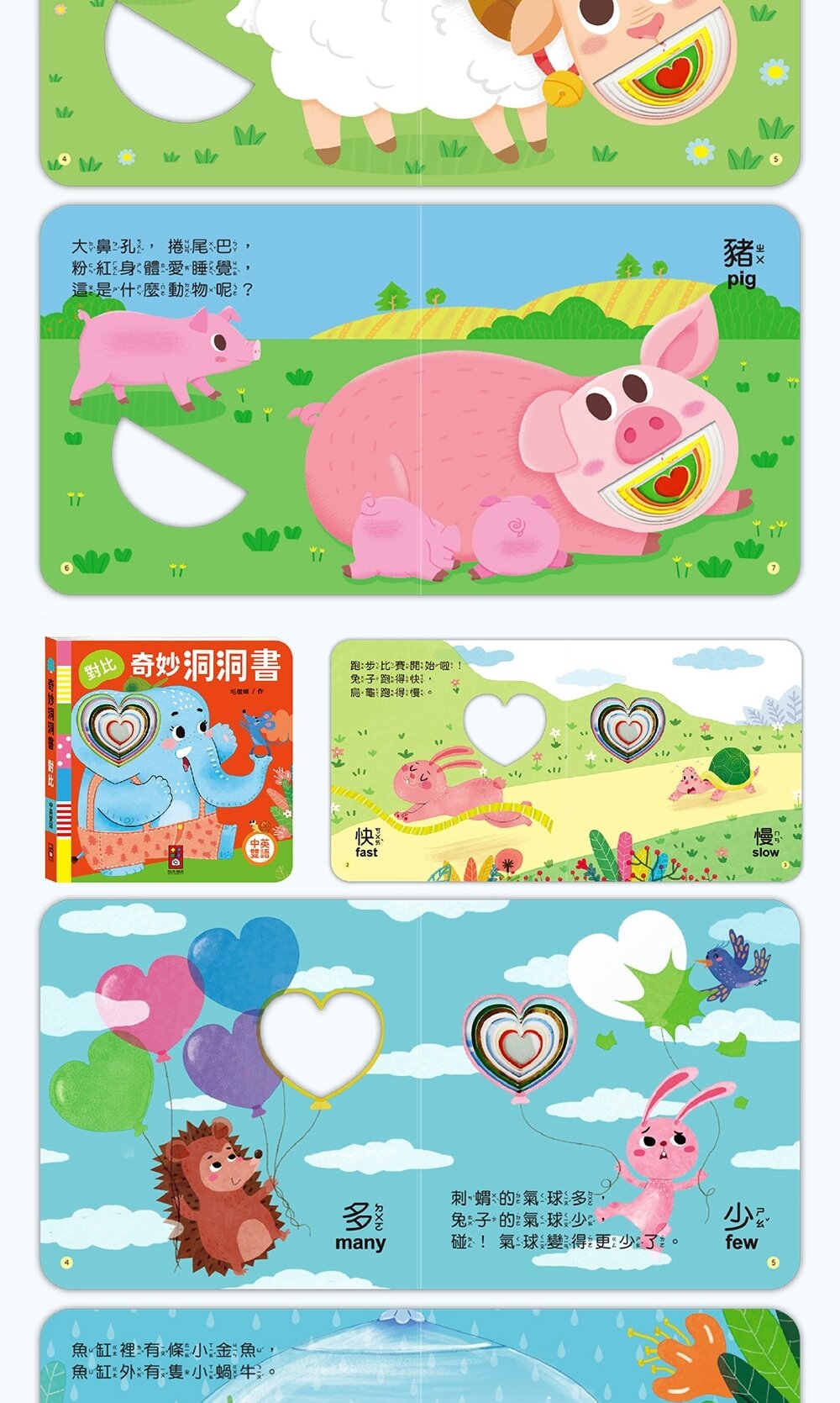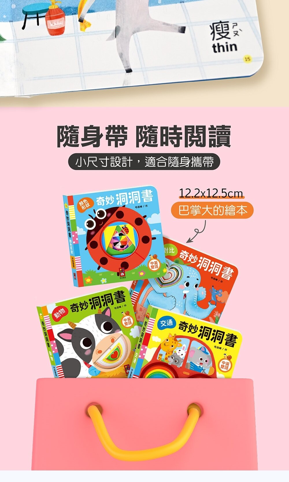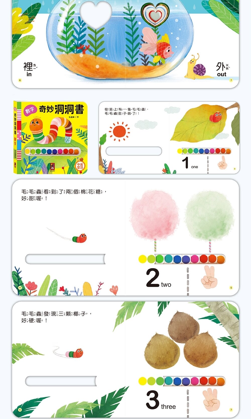 每本書都有不同造型或大小的洞洞,讓孩子可以觸摸、戳挖,促進手指精細動作訓練。