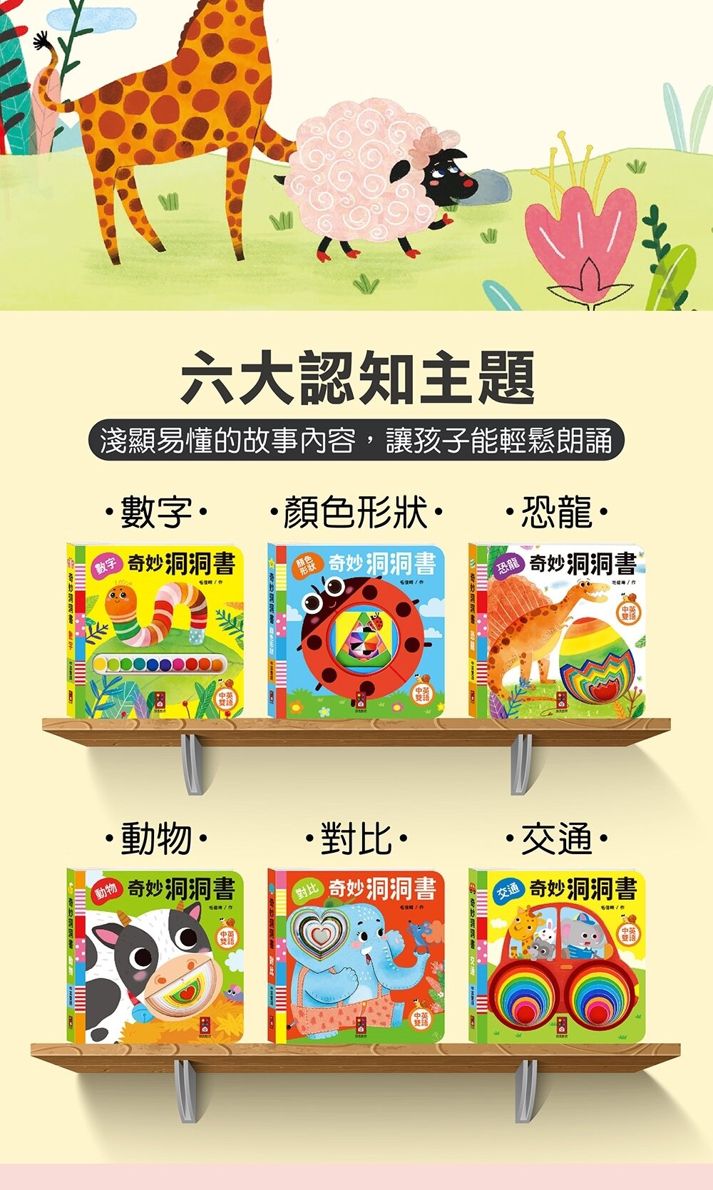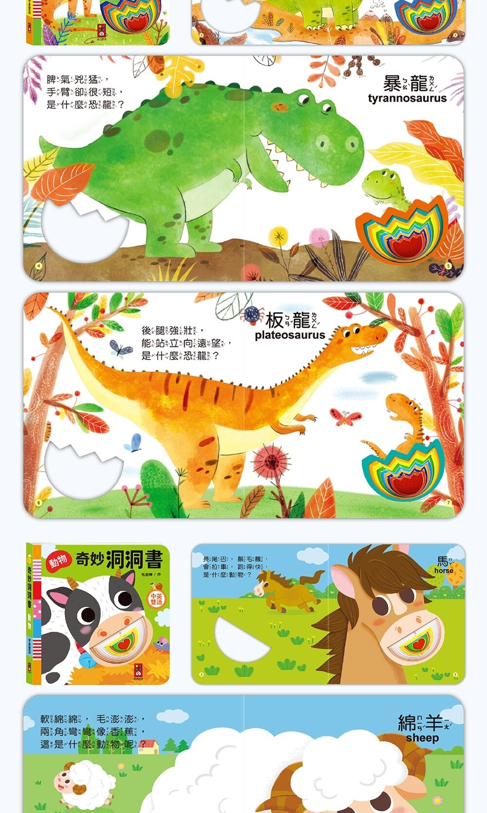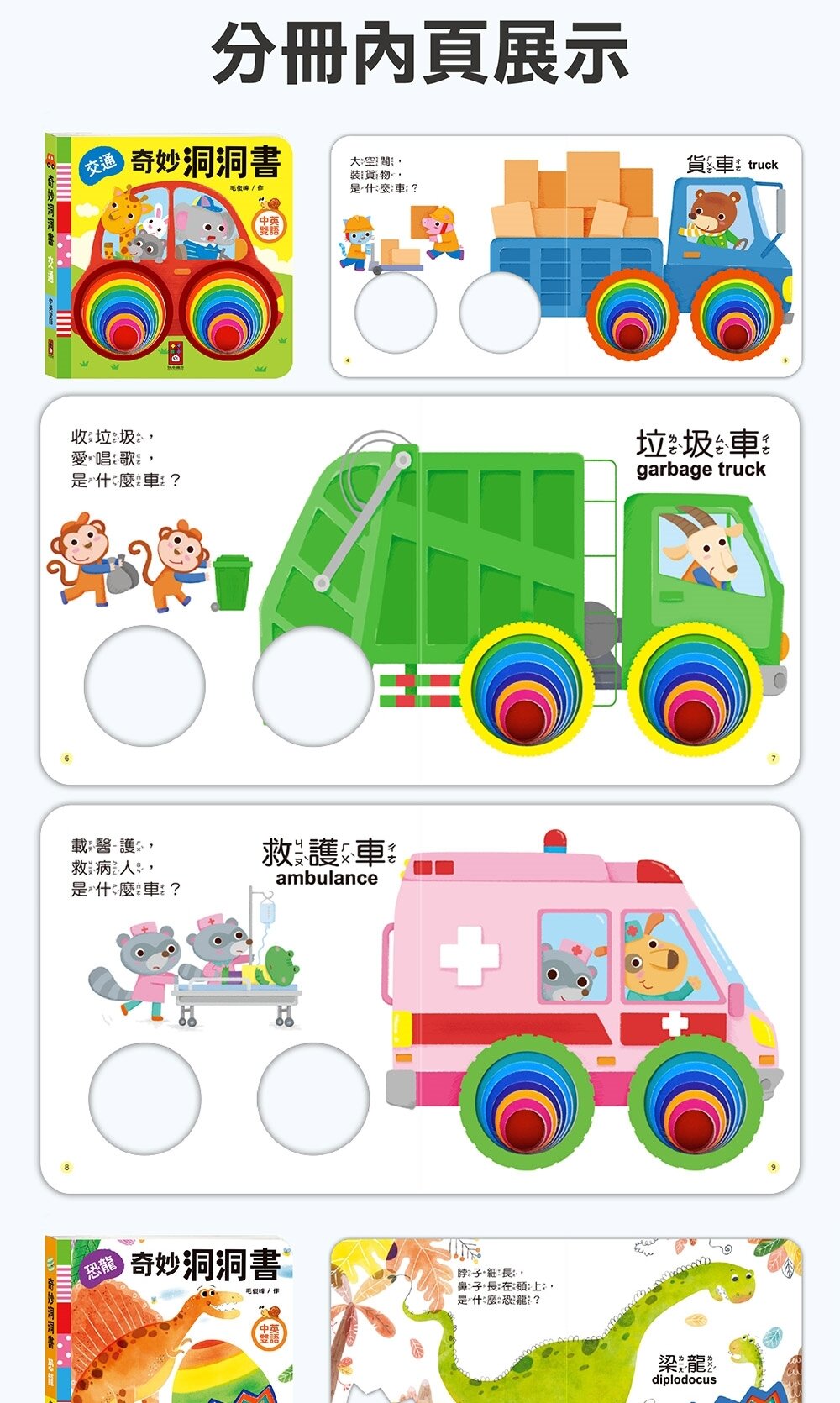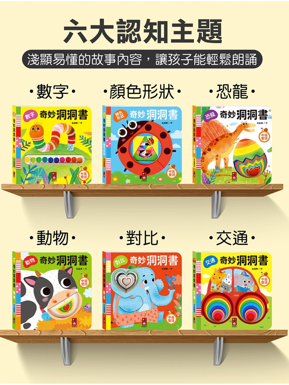 本套書內含多變主題與議題,如:顏色形狀、恐龍、數字等適合認知類,也有如交通、數字、對比等基礎概念類,利用淺顯的文字、單詞讓孩子輕鬆學會認知,中英雙語也能讓孩子從小培養第二外語的語感,而精美鮮豔的繪圖風格也能吸引孩子目光,幫助孩子主動認知學習,洞洞發揮想像力與創造力,激發腦力潛能。