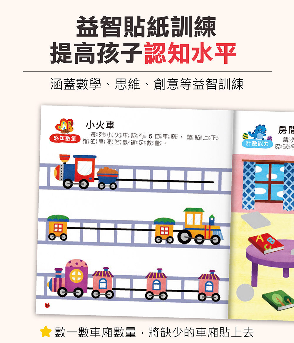 ★配合數認知題目玩貼紙,提升孩子的智能發展與數感能力。