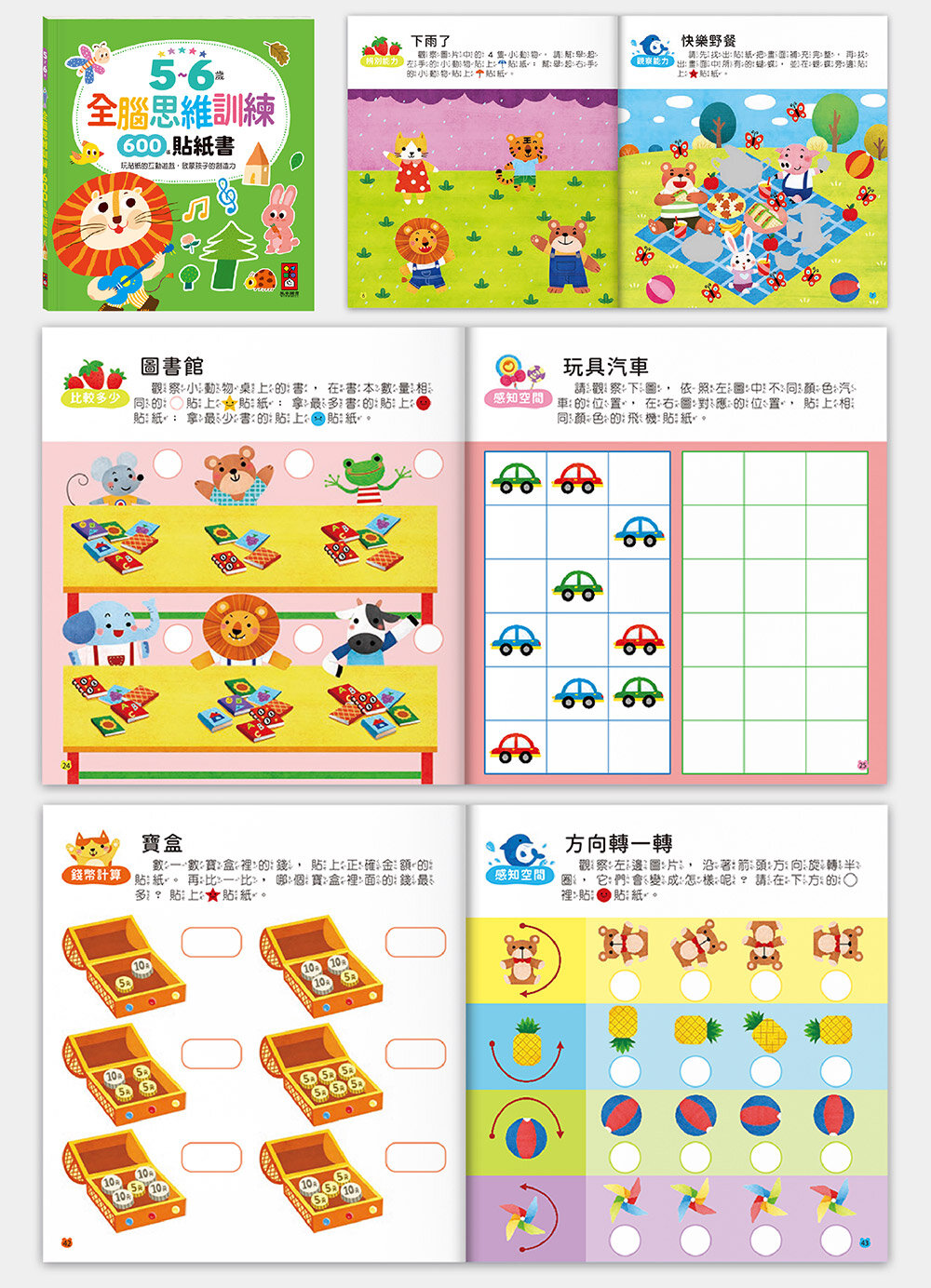 除了貼紙遊戲外,書中的題型還包含數認知、連連看、找一找、比較和分類、觀察和推理、迷宮遊戲等,幫助孩子提升專注力和智力。