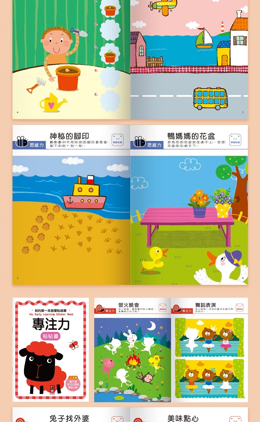 鮮豔精緻又可愛的插圖吸引孩子目光,刺激孩子探索慾望,動動小手貼貼紙。
