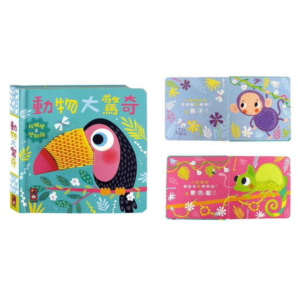 《動物大驚奇》有各種色彩繽紛的動物,包括:花豹、變色龍、猴子等,一邊閱讀有趣的主題內容,一邊觸摸各種矽膠圖案,在遊戲中多樣化學習,探索神奇的動物世界吧!