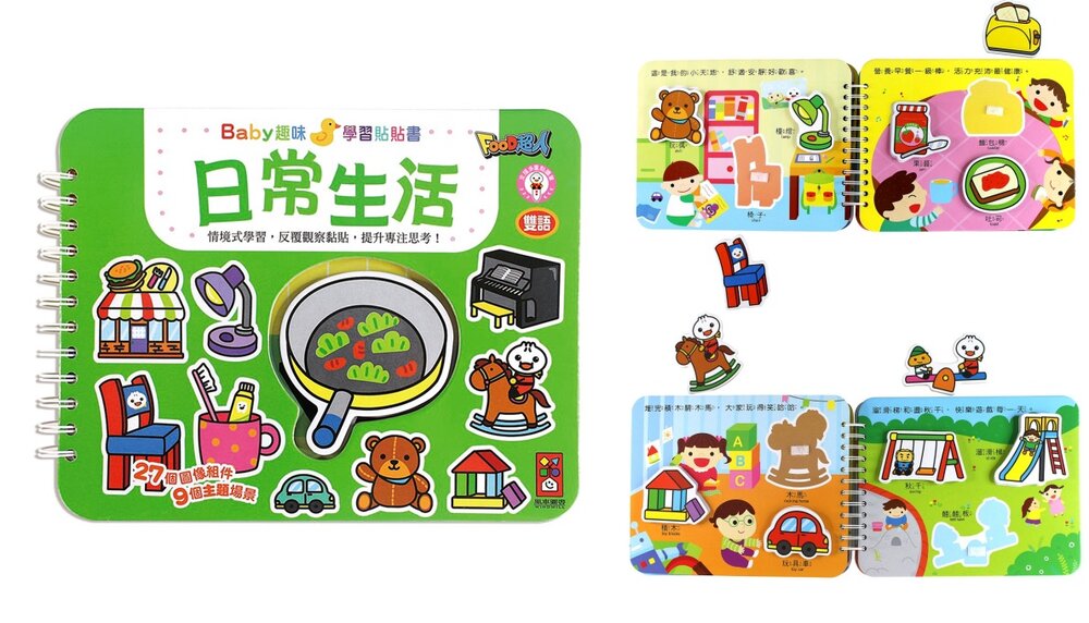 1. 色彩豐富、形象生動,讓寶寶在看圖黏貼的遊戲中,認識生活用品。
