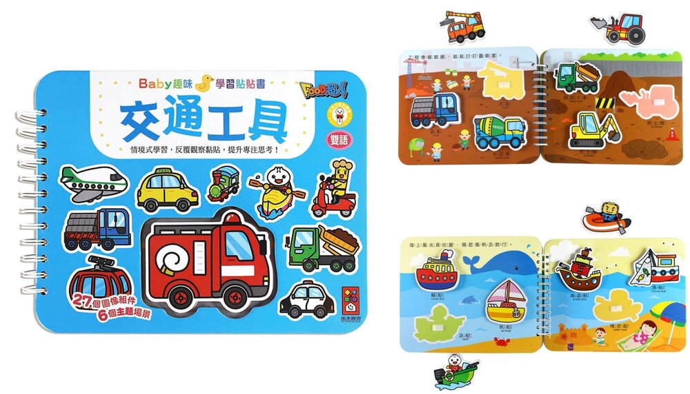 1. 色彩豐富、形象生動,讓寶寶在看圖黏貼的遊戲中,認識交通工具。