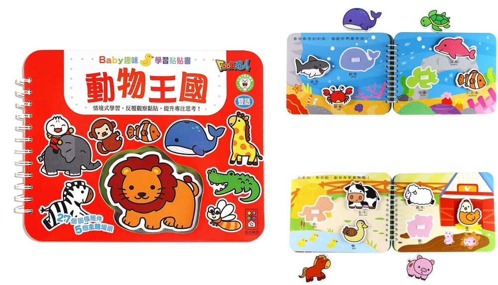 1. 色彩豐富、形象生動,讓寶寶在看圖黏貼的遊戲中,認識可愛動物。