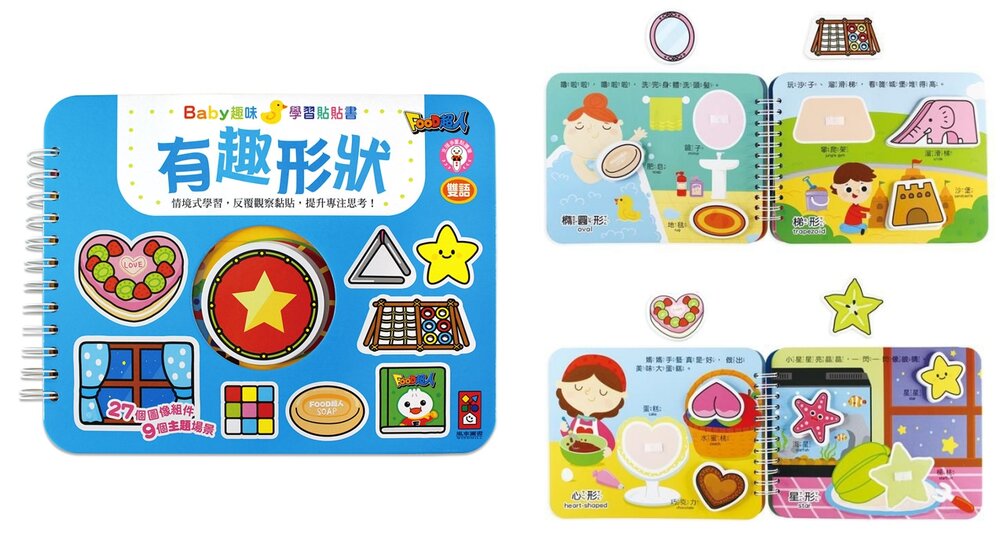 1.色彩豐富、形象生動,讓孩子在看圖黏貼的遊戲中,認識各種形狀。