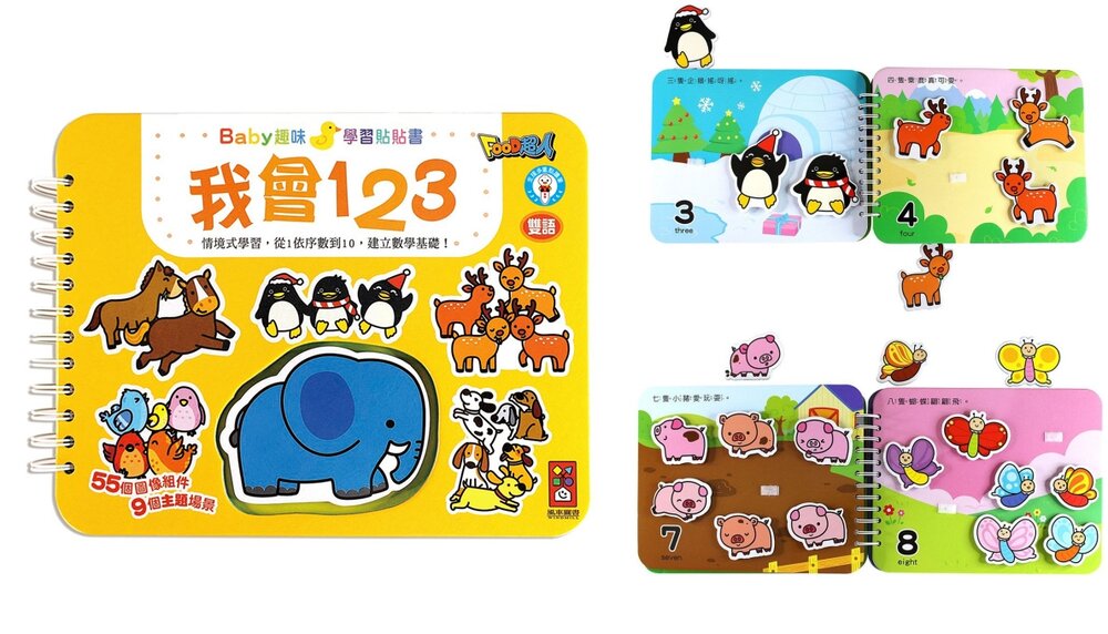 3. 以寶寶喜愛的動物為背景,讓寶寶認識學習數數,家長可同時搭配生活的用品,讓寶寶練習數數看數量。