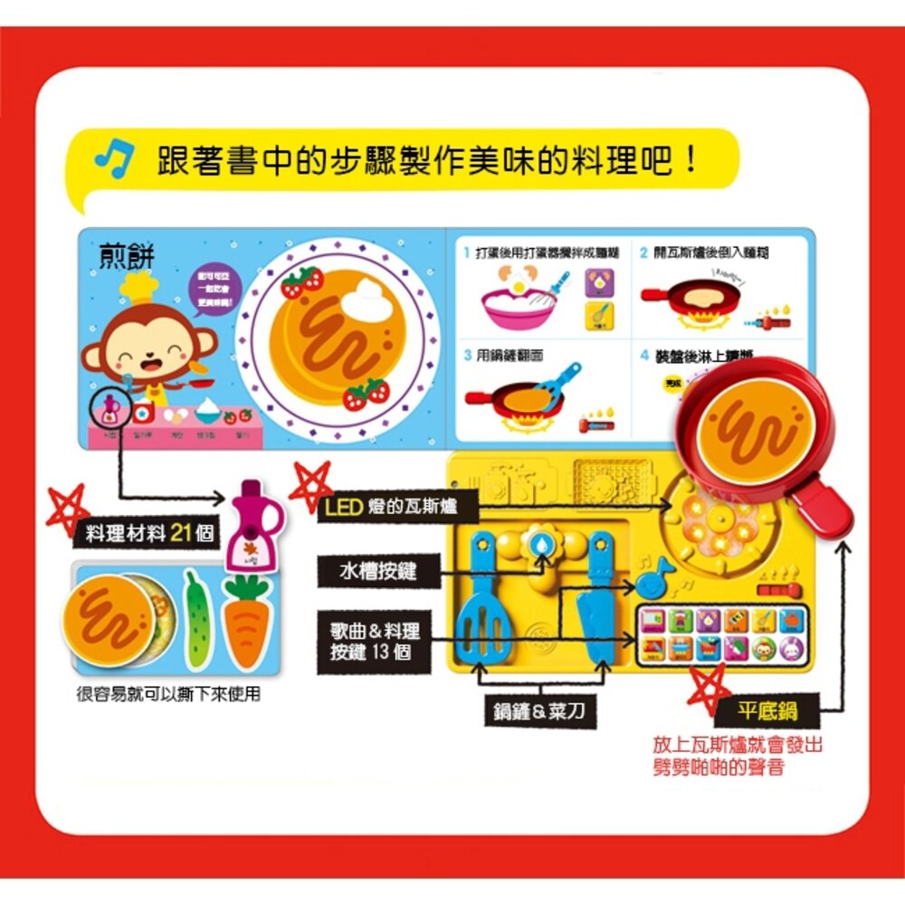 S022 廚房遊戲 屬於孩子的第一個廚房誕生囉! 內容包含16個遊戲鍵、21個料理材料及5個廚房工具。 採用特殊設計更有實體感。 播放快樂的童謠,跟著書中的步驟開心地製作料理吧! 尺寸:215×258×24mm 材質:紙、塑膠 需自備2顆AAA電池 商品檢驗標識字號(BSMI):M54635