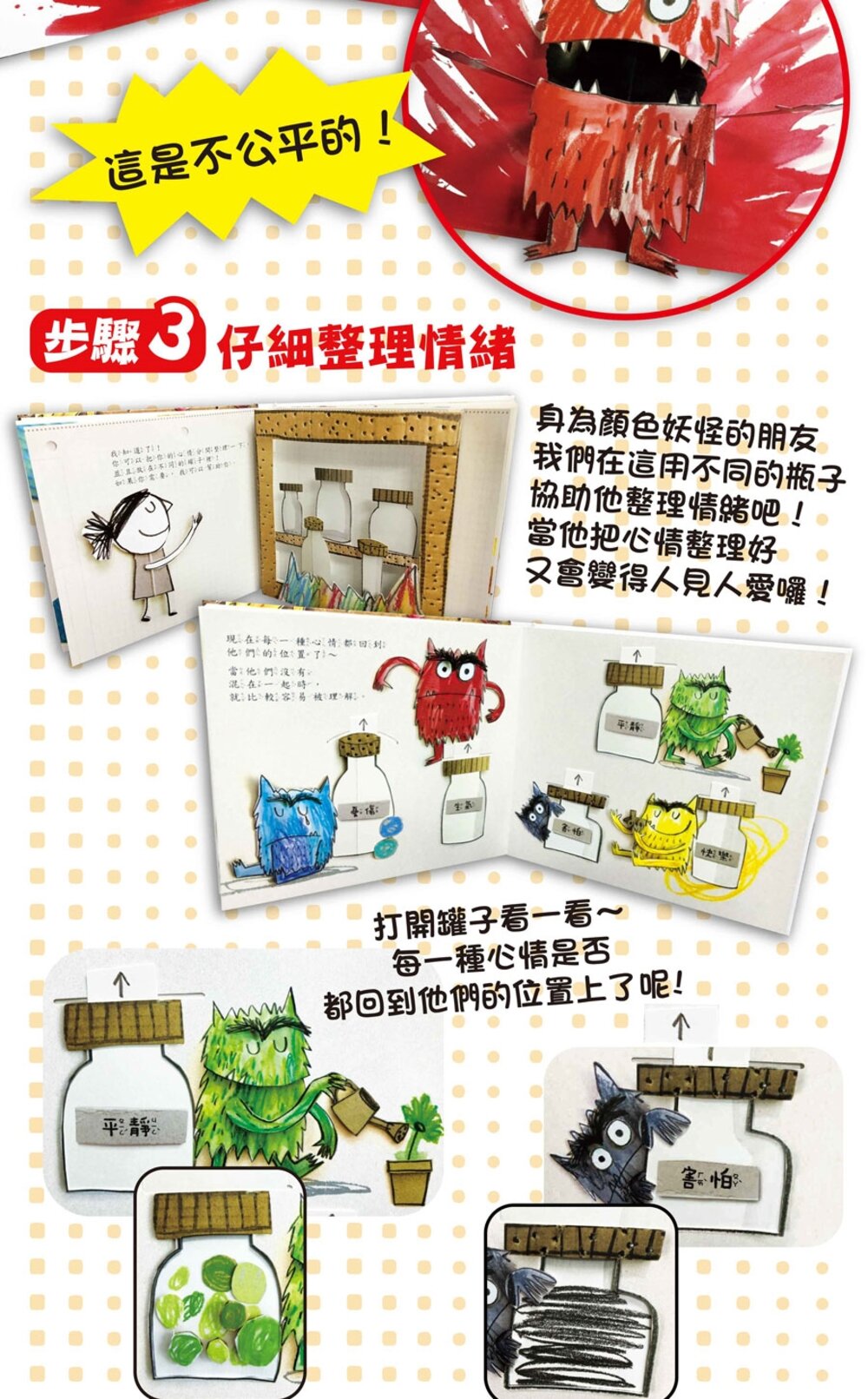 顏色妖怪覺得今天的心情有點亂,他需要修補他混亂的情緒。他有辦法把快樂、憂傷、生氣、害怕和平靜放回原位嗎?