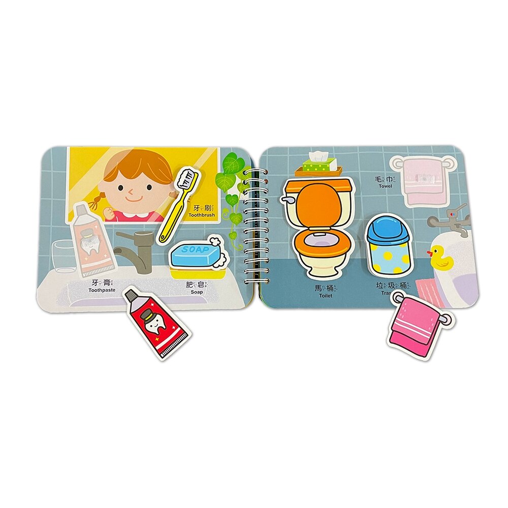 探索家裡的每個角落吧!從家具、家人到寵物與生活用品,孩子在熟悉的生活場景中學會表達與分類。