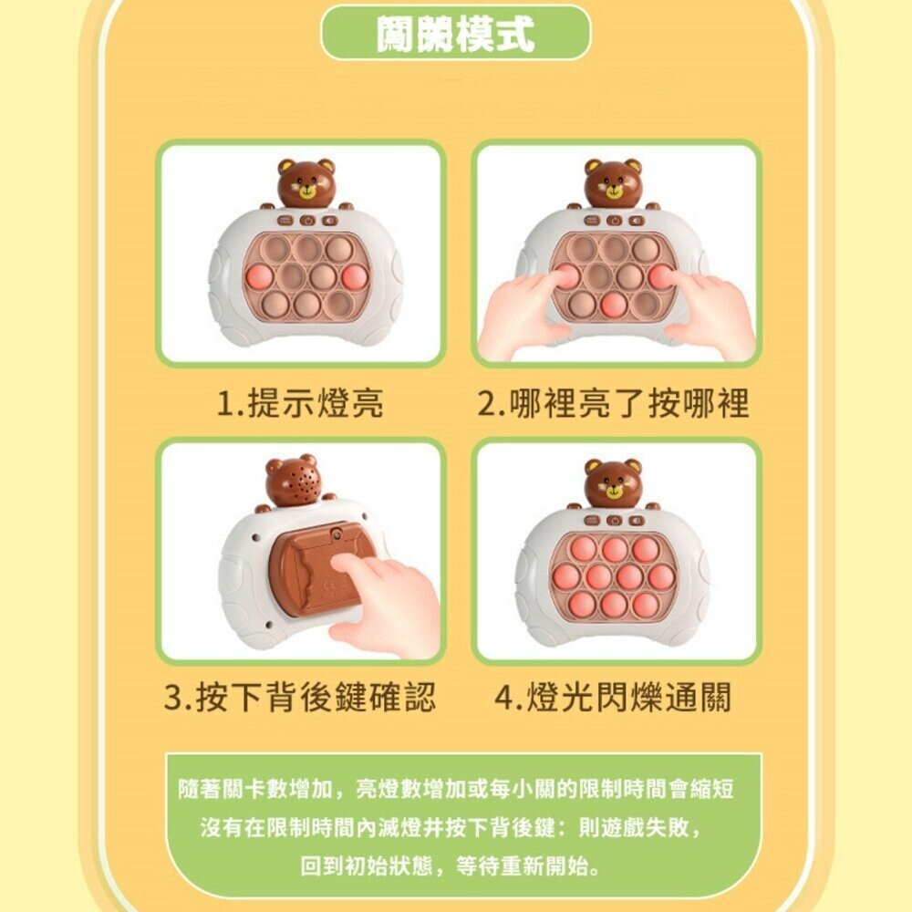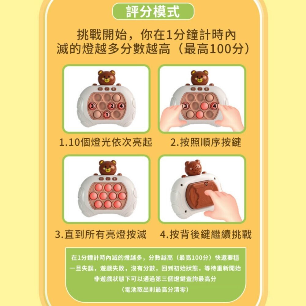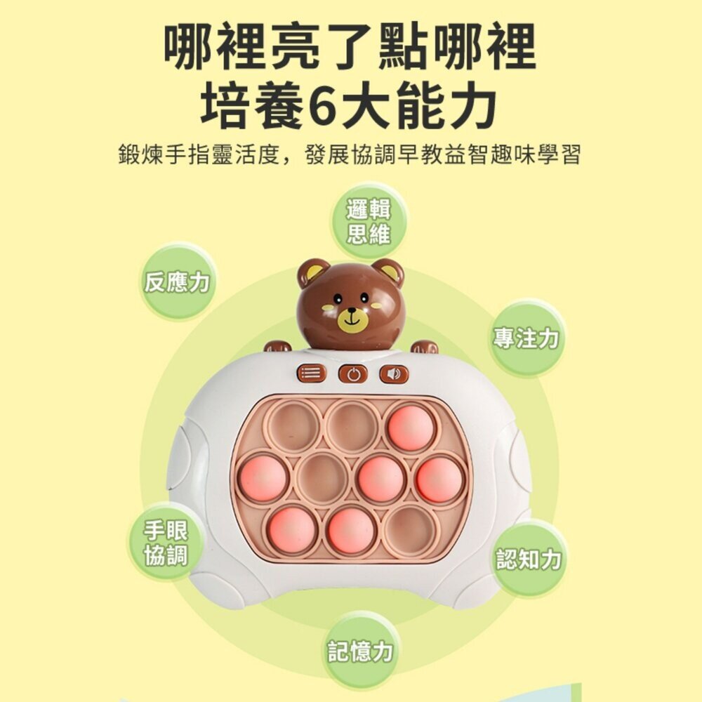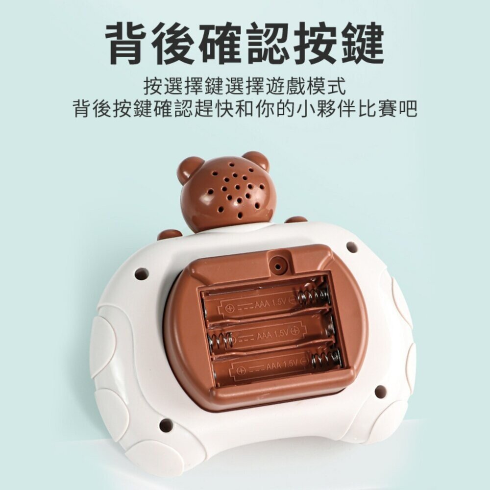 這款掌上型打地鼠遊戲機,靠「燈光提示+按鍵操作」進行遊戲挑戰,玩法直覺簡單,小朋友能自己玩,大人也能一起互動同樂。從反應訓練到記憶挑戰,每次操作都是一次腦力和手速的冒險!