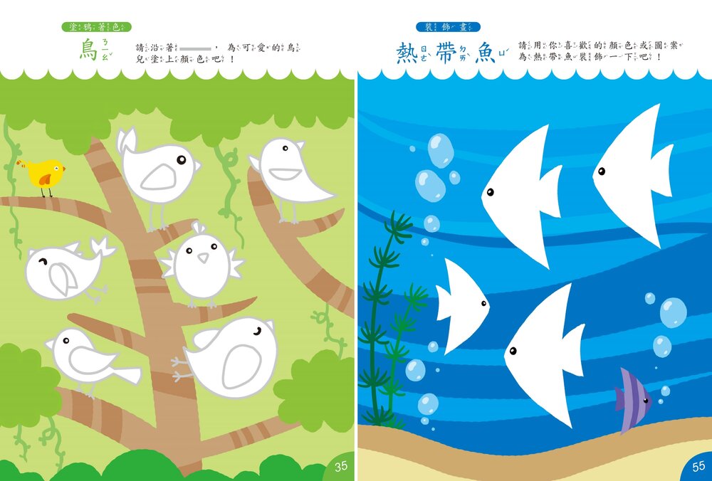 《創意畫》提供開放式的主題情境,引導孩子發揮想像力,為甜甜圈添上新花樣、幫怪獸畫出新造型,