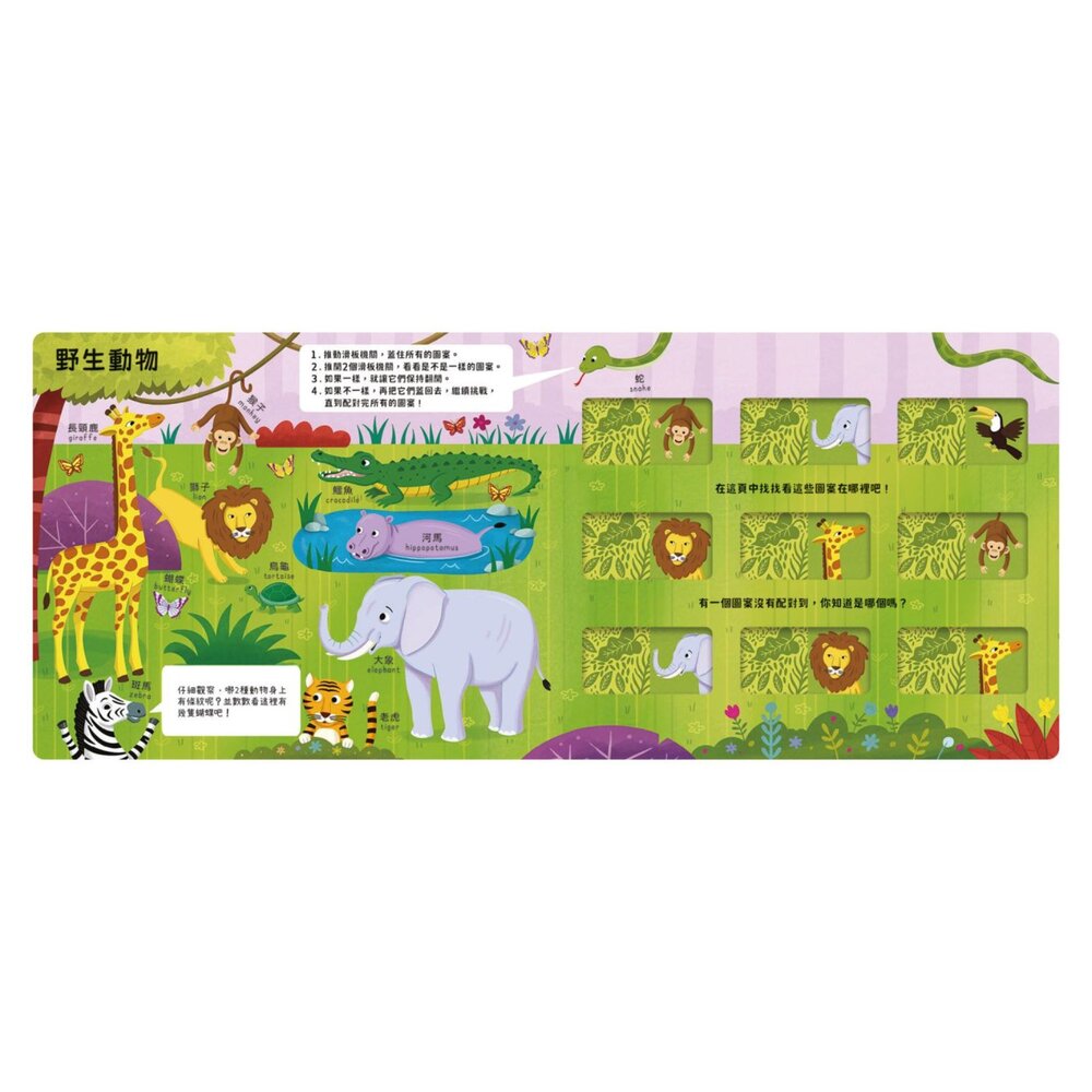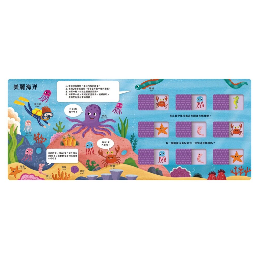 這套《推推記憶遊戲書》一次收錄「海洋大考驗」+「動物大考驗」,超過60個中英雙語單字搭配互動機關設計,不只學得快、記得牢,還能讓孩子在玩樂中提升專注與觀察力!