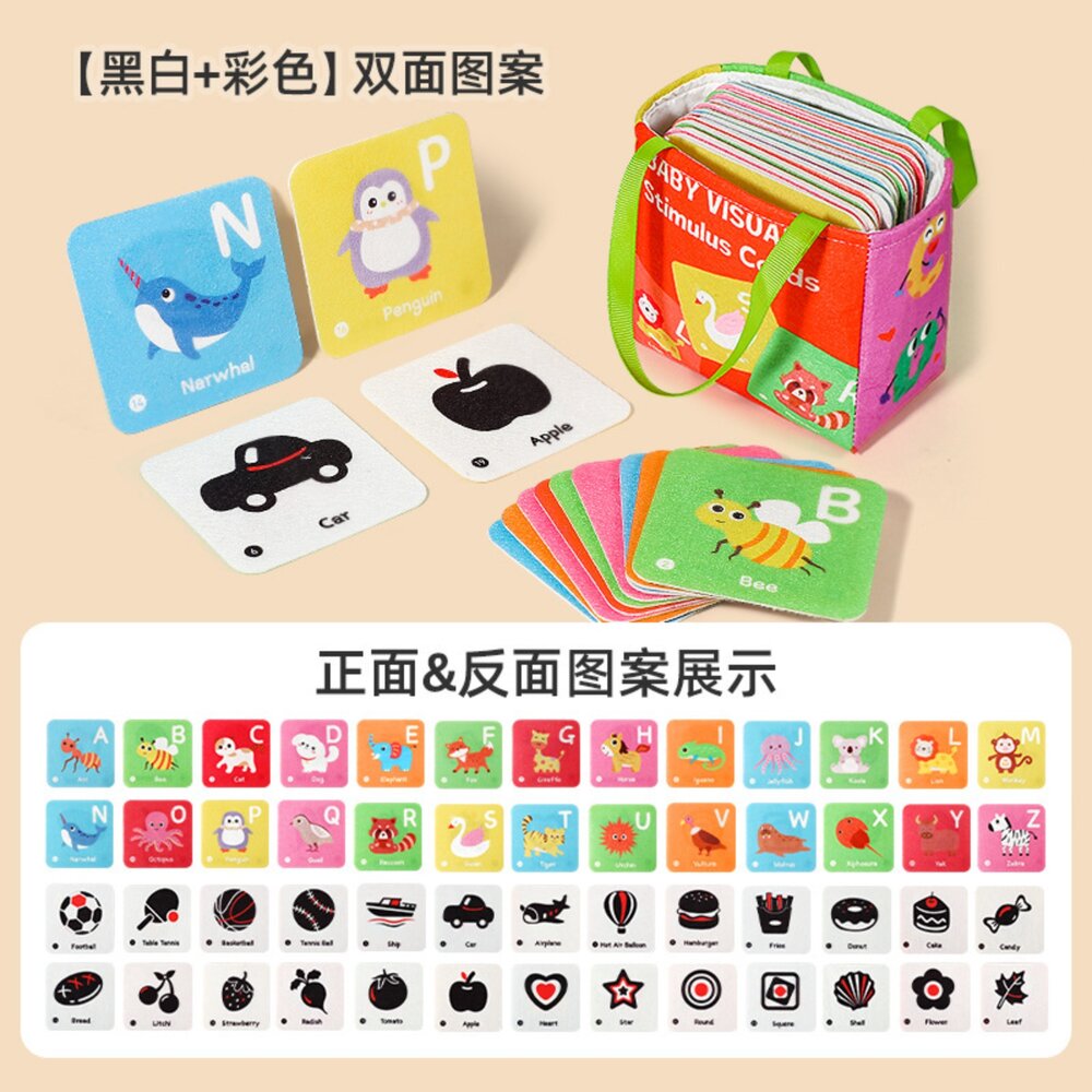 根據寶寶視覺發展階段,巧妙設計雙面圖卡內容: