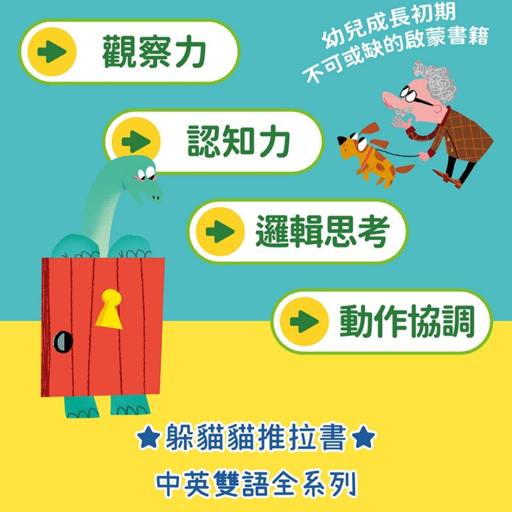 《躲貓貓推拉書》讓寶寶用小手推一推、拉一拉,把大象、老虎、獅子、恐龍、猴子、熊、鱷魚、貓熊一一找出來。