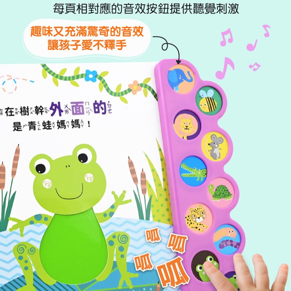6 大動物主題 × 10 種趣味音效,每翻一頁都有驚喜!