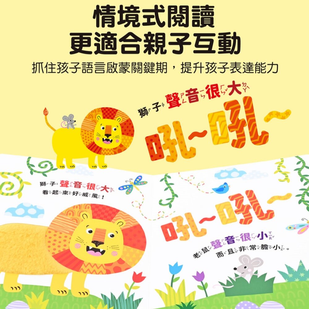 家長可以和孩子一起聽音效、玩觸摸、說故事,在笑聲與驚喜中增進親子互動。跨頁大場景+故事內容,讓閱讀更沉浸,學習更自然。