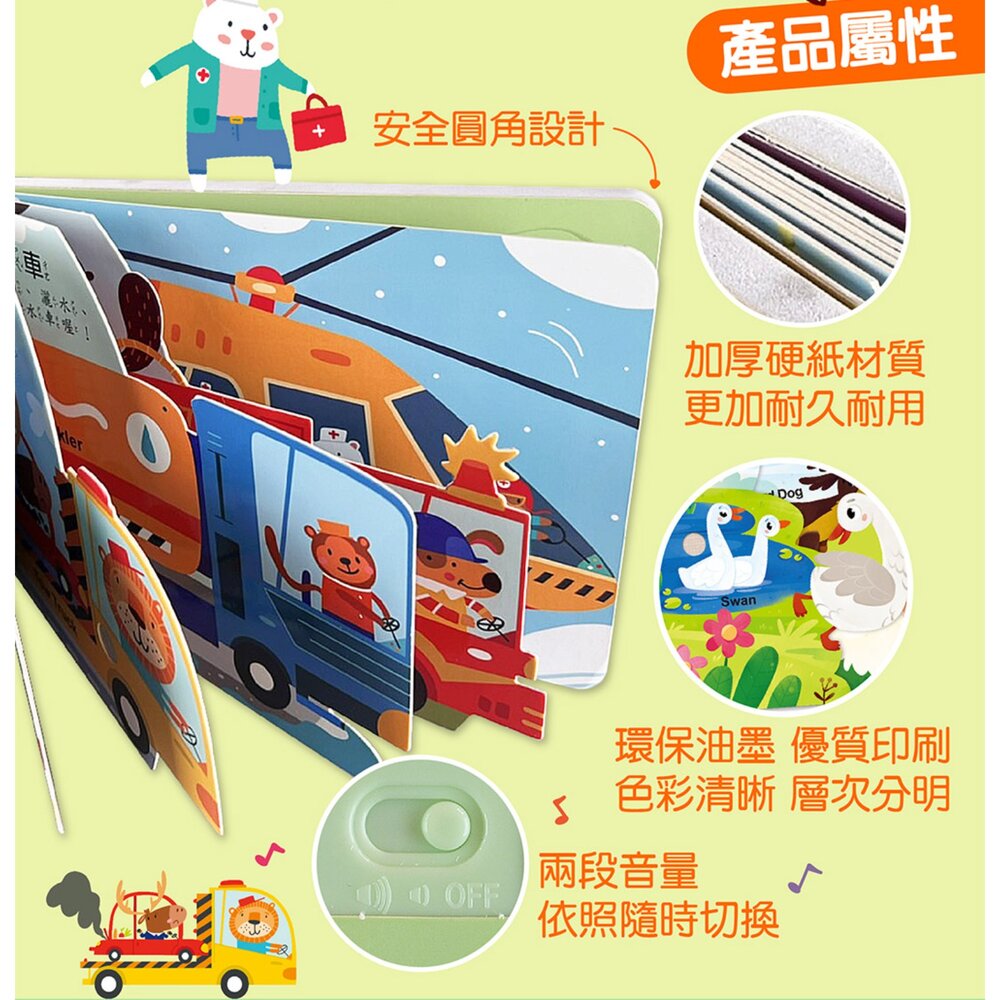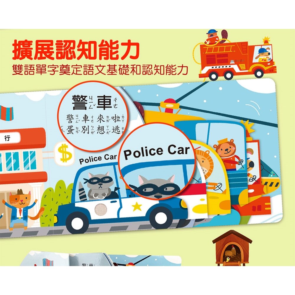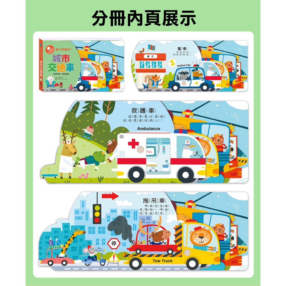 • 《城市交通車》:警車、消防車、救護車、直升機……逼真的音效讓孩子體驗城市裡忙碌又有趣的交通世界。