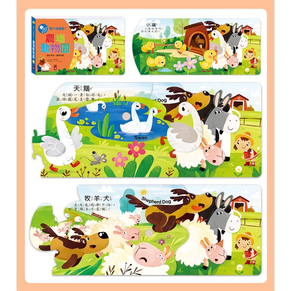 • 《農場動物園》:咯咯叫的小雞、咩咩叫的綿羊、憨厚的驢子……透過音效與插圖,孩子彷彿真的置身歡樂農場。