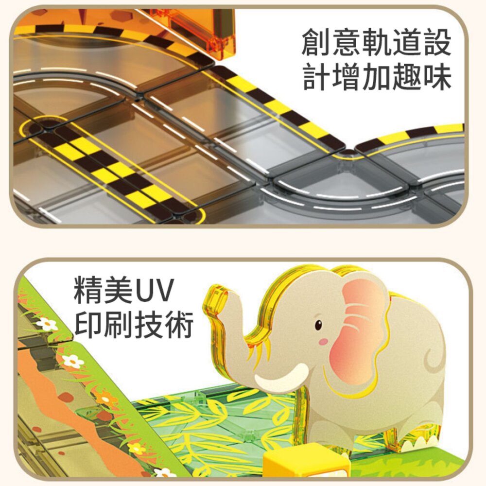 這套磁力電動軌道車,結合了磁力片的無限造型與電動車的動態樂趣,