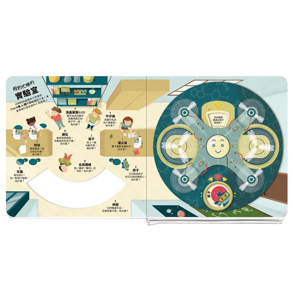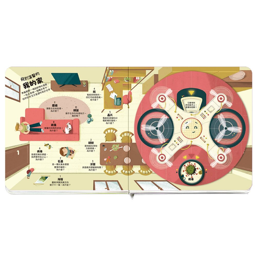 每一頁都像是把顯微鏡塞進故事裡,孩子轉動無人機,就能找到藏在物體深處的微觀結構。