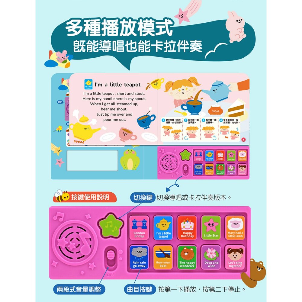 10 首律動兒歌+卡拉伴奏模式切換,小手按鍵即可播放/停止,搭配情境插圖與動作步驟,讓孩子唱唱跳跳、節奏學習與肢體協調一次完成,也讓閱讀成為充滿音樂的親子陪伴時光。