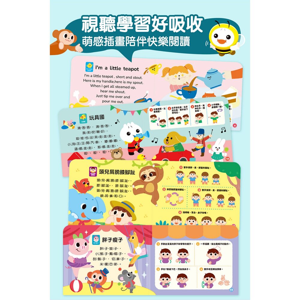 當寶寶按下按鍵、聽見旋律,小手揮動、小腳跟著擺動;家長在旁一起唱、一起跳,每天的閱讀時光,變成溫柔而快樂的成長儀式,陪孩子在遊戲中培養節奏感、自信與表達力。