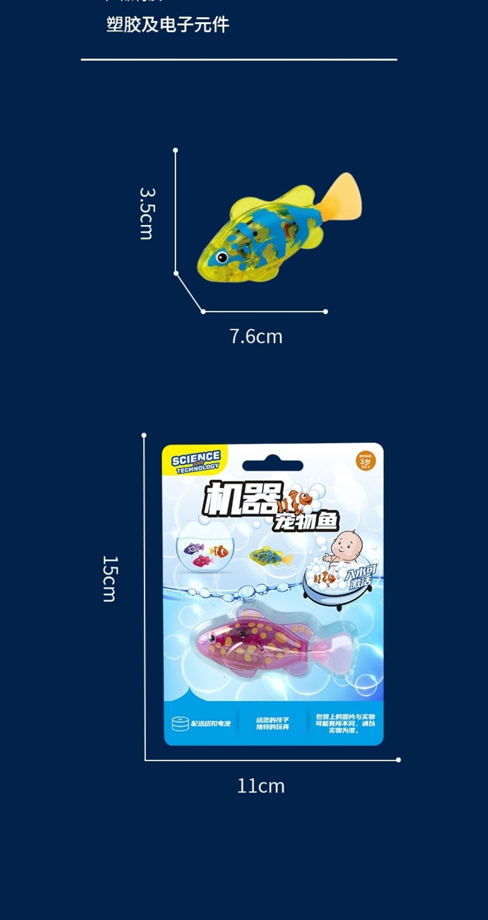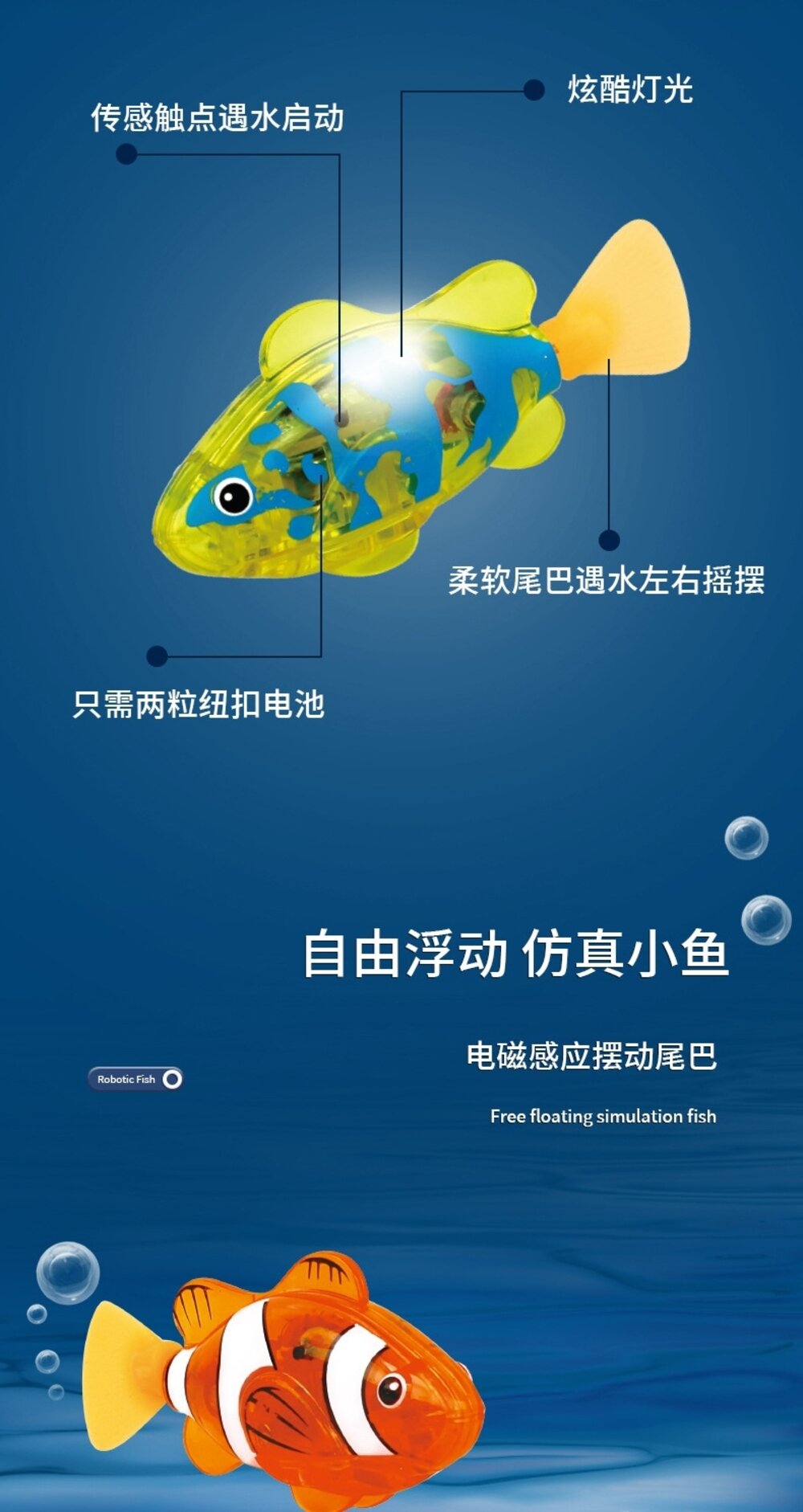 2.小魚如果出現進水情況請不要著急,先拆開電池蓋取出電池,擦乾水漬,待魚晾乾重新放入新電子小魚就好了哦!!!