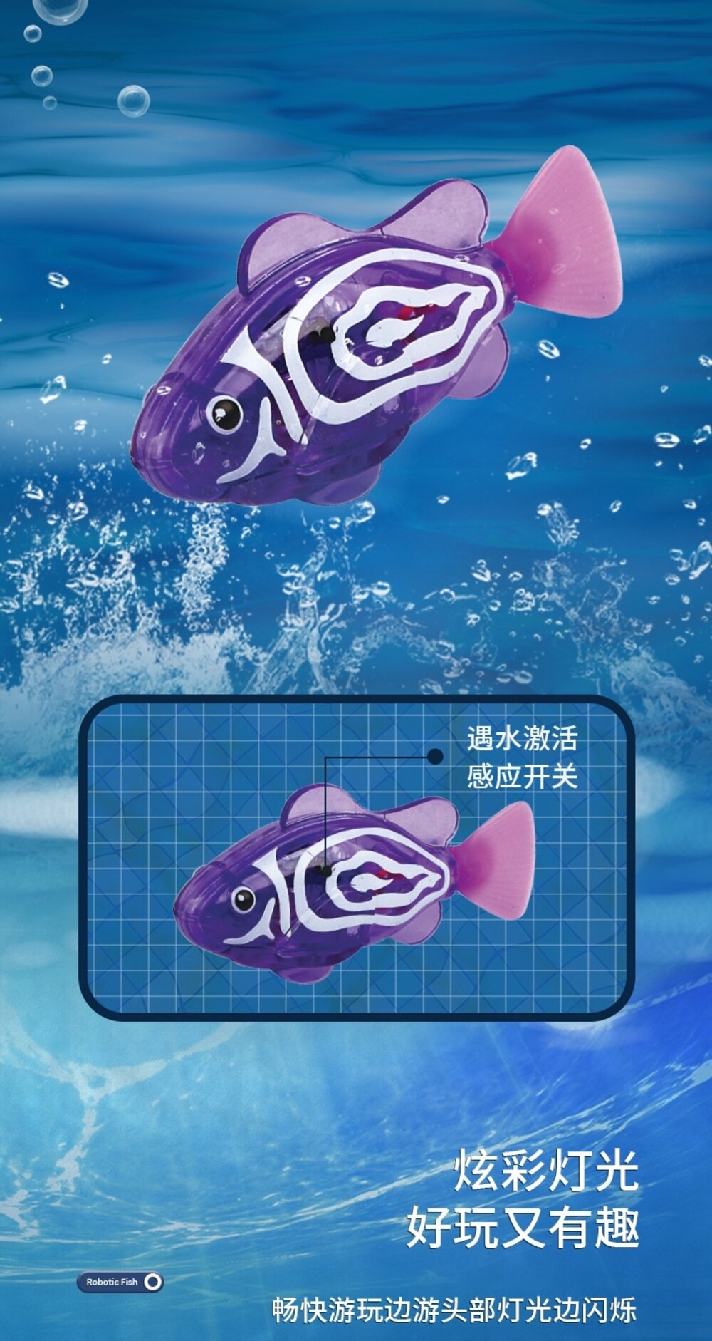 本產品為電子玩具,與真實魚類不同,請勿長時間持續浸泡於水中,